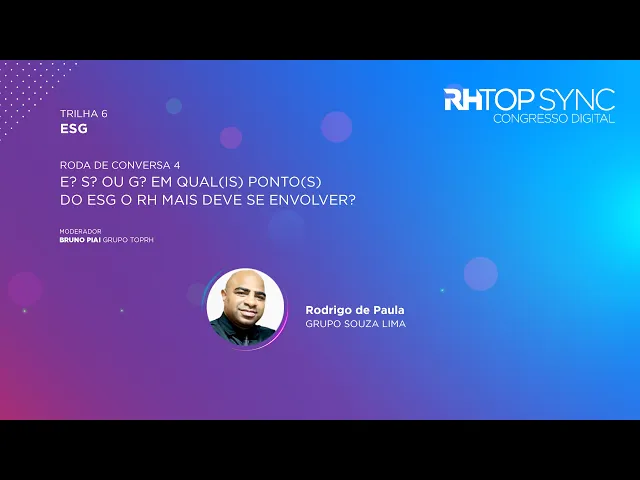 [Música] trilha 6 esg e s ou G em qual ponto do esg o RH mais deve se envolver convidado Rodrigo de Paula grupo Souza Lima moderador Bruno piai fala pessoal sejam todos muito bem-vindos e todas muito bem-vindas a mais uma atração do RH tops 2024 Estamos aqui na nossa trilha de número seis que é a trilha de esg e o assunto da vez é esg em quais pontos que o RH mais deve se envolver quando a gente tá falando aí do do que forma essa sigla que é pequenininha mas que traz tanta coisa aí que