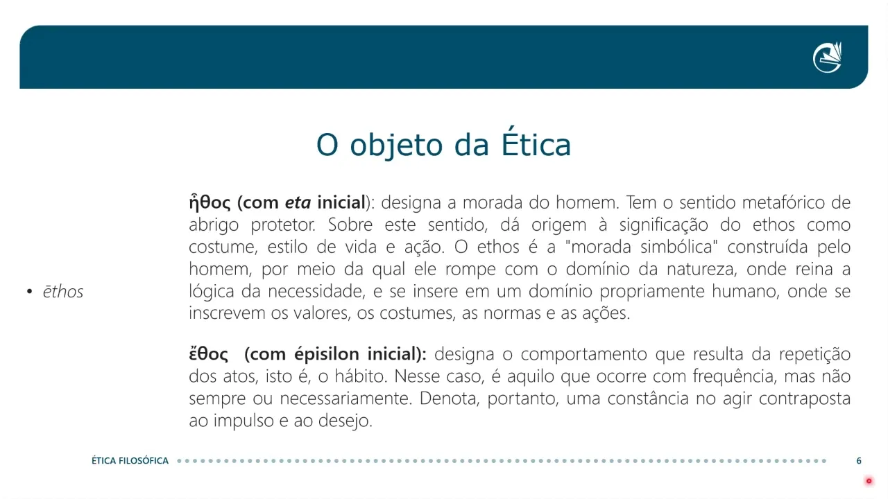 ET Inicial e outro com éson a gente vai ver agora como que essas duas formas deos elas nos ajudam a compreender melhor o objeto da ética então o éos pode ser escrito nessa primeira forma a primeira letra sendo a letra grega eta e que designa a morada do homem então ela tem um sentido metafórico de de abrigo protetor e sobre esse sentido se dá dá origem a significação do etos como costume estilo de vida ação o éos aqui é compreendido como a morada simbólica construída pelo homem pelo qual ele rompe com aquele domínio da natureza