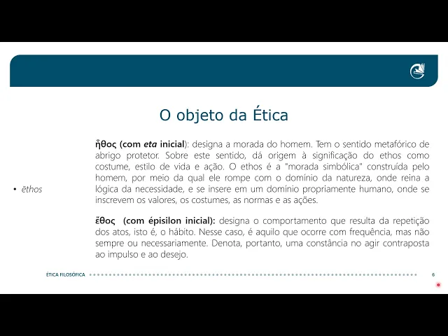 uma investigação sobre o etos e a pergunta que a gente faz agora é o que que é o etos então o que que é isso que chamamos deos o objeto da ética o termo designa o conjunto de modos de comportamento que configuram a identidade social de um grupo humano então o etos é a sínteses do costume de um povo são aqueles traços característicos de um povo que o permite distinguir de outros povos então aqui se dá uma identidade coletiva uma identidade social Então esse termo etos é a transliteração de dois vocábulos gregos um escrito com