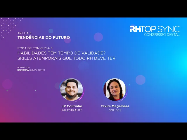 trilha três tendências do Futuro habilidades T tempo de validade Skills atemporais que todo RH deve ter convidados JP Coutinho palestrante Tavira Magalhães solids moderador Bruno piai fala pessoal sejam muito bem-vindos e muito bem-vindas a mais uma roda de conversa aqui no nosso RH top 5 2024 vamos seguir com a terceira roda da trilha de tendências do Futuro agora pra gente discutir sobre habilidades será que as tão faladas Skills de hoje em dia elas tem tempo de validade Quais que são atemporais por assim dizer bom antes de eu apresentar aí quem vai nos guiar por essa