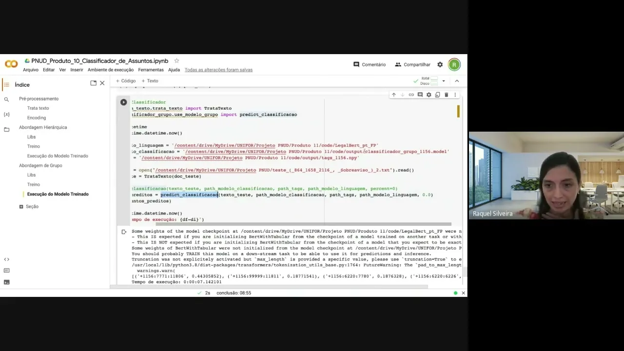 a partir de um modelo eh específico né de um grupo é como se assim já já tivesse feito esse essa decisão né de qual o modelo que nós queremos utilizar tá então faz aqui a chamada né Desse predict Class ação e a saída vai vir aqui nesse assunto predito eh levando em consideração esse trold que nós configuramos então vai mostrar todos os assuntos cujo percentual de convicção está acima do trech mais uma vez aqui configurei como zero porque o modelinho foi treinado com poucos dados e com poucas épocas tá e a saída vai estar bem