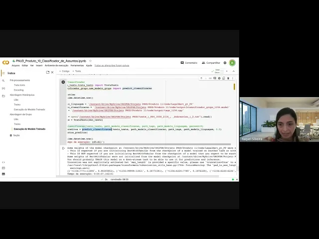 [Música] aí depois de treinado da mesma forma como nós mostramos anteriormente agora a gente vai usar vai usar o modelo que nós treinamos para fazer a predição em um uma nova petição inicial tá eh então do mesmo jeito como nós mostramos anteriormente nós obtivemos aqui um documento para testar né fizemos a leitura e guardamos aqui o texto desta petição inicial dentro desta variável texto teste e utilizamos o módulo predict classificação tá sendo que esse módulo predict classificação esse que nós vamos usar agora ele está dentro do classificador de grupo né que foi o modelinho que