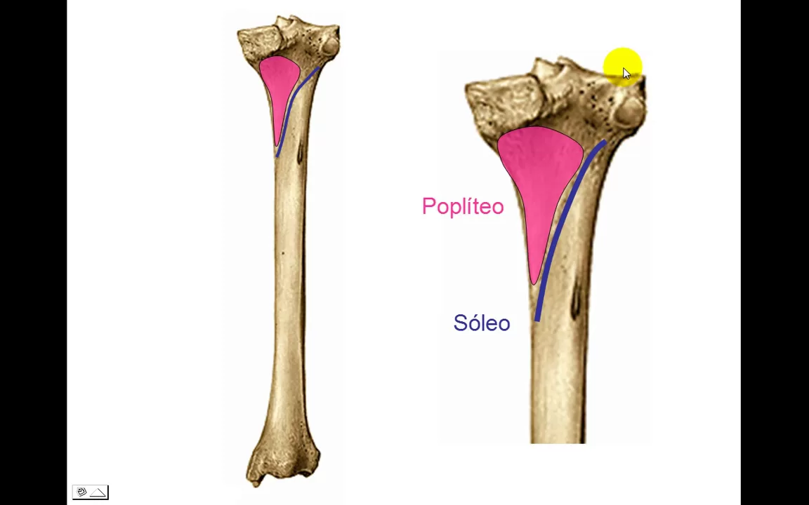 en la tibia se va a insertar el popliteo el flexor común de los dedos y el tibial posterior estos después se cruzan Pero no importa porque eso lo vamos a ver cuando veamos músculo Ahora sí tibia vista posterior ampliamos un poquito señor director esa qué nivel lo primero la tensión de la cara posterior de la tibia es esta línea oblicua línea oblicua de la tibia que va a insertar al músculo sóleo eso se pregunta siempre por arriba una zona triangular de base superior que va a insertar al músculo popito y por abajo lo que queda