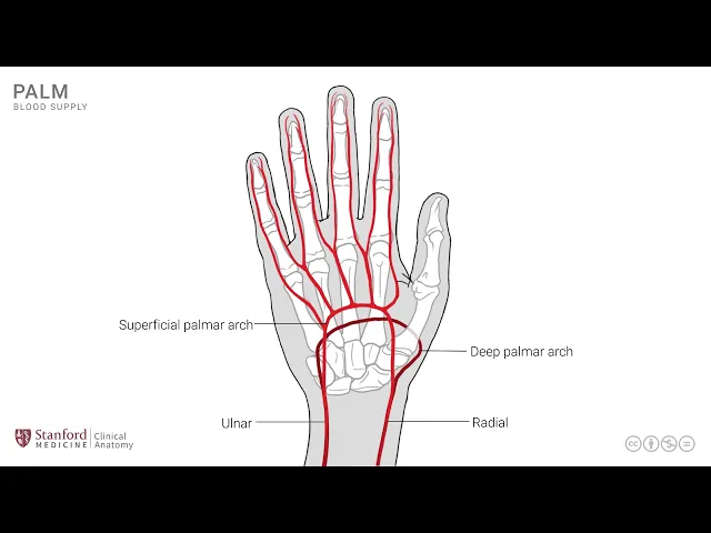 actually mix meet up with each other the superficial arch and the palmar arch both of them supply the rest of the hand by dividing into multiple smaller branches the superficial palmar arch gives off several branches typically somewhere between three to five and these run down the hand and then divide into what are known as digital arteries and run with the digital nerves on either side of the digits so there's one for the ulnar side of the digit and one for the medial side similarly the deep palmar arch also gives rise to a number of smaller