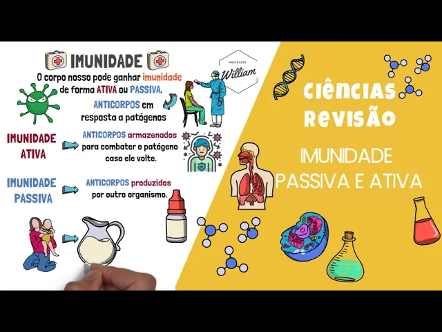 professor Willian aqui para te ajudar Hoje iremos fazer uma revisão rápida sobre uma idade passiva e ativa nesse vídeo vamos abordar sobre os tipos de imunidade e sem mais enrolação vamos lá o nosso corpo pode ganhar imunidade de forma ativa ou passiva quando o corpo combate uma infecção ou Doença ele produz anticorpos e resposta ao patógeno que é o agente que causa doença ou infecção nesses casos esses anticorpos são mantidos armazenados para combater o patógeno caso ele volte O que é uma forma de imunidade a chamada imunidade ativa você também pode ganhar imunidade recebendo anticorpos
