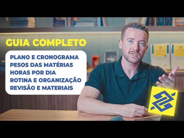 se você vem acompanhando a situação do concurso do Banco do Brasil você sabe que ele está cada vez mais perto e quanto mais o tempo passa mais é importante eu vir aqui destacar para vocês que é extremamente importante que vocês comecem a estudar nesse momento inclusive eu já estou contando que você já começou a estudar mas no vídeo de hoje eu vou abordar com você uma estratégia para você fazer um plano de estudos efetivo para esse concurso e também uma estratégia para você estudar de uma forma que realmente te leve a ter a aprovação da melhor forma possível eu separei uns tópicos muito importantes para falar com você nesse vídeo então olha só tudo que a gente vai abordar no vídeo de hoje eu vou começar falando sobre os benefícios do cargo depois a gente vai comentar um pouquinho sobre a banca desse concurso vamos falar também a questão do cronograma de estudos vou falar com você sobre o peso das matérias para que você saiba como que você deve organizar qual matéria que você vai estudar mais tempo qual matéria que você vai estudar menos tempo inclusive quais matérias que você tem que estudar agora no pré-edital e depois no pós-edital quais matérias que você vai adicionar no seu cronograma também vou abordar com você quantas horas por dia você deve estudar qual que é a melhor hora do seu dia quais são as melhores formas de você organizar sua rotina para você fazer esse estudo da melhor forma possível considerando também o pré e o pós edital vamos falar sobre a melhor forma de revisar e como que você pode encaixar isso na na sua rotina de forma que o seu estudo realmente ande que você não se pegue preso gastando todas as suas horas de estudo na revisão além disso eu vou passar para você também alguns pontos para você considerar quando você for escolher o seu material para você estudar para esse concurso porque é extremamente importante que você não escolha o material errado porque ele vai ser a fundação que você vai utilizar para construir a sua aprovação nesse concurso se você tiver com um material que não faz sentido com o perfil dessa prova com o perfil desse concurso muito provavelmente você vai se atrasar então sem mais enrolações vamos iniciar o nosso vídeo meu querido nós estamos falando aqui sobre o cargo de escriturário bancário especificamente para o cargo de agente comercial que é esse cargo da carreira do Banco do Brasil que é muito interessante por dezenas de motivos mas principalmente porque você vai trabalhar apenas 6 horas por dia e porque uma vez dentro do banco a sua progressão de carreira ela é ilimitada você vai crescendo lá dentro você tem a oportunidade de ir subindo os cargos cumulando responsabilidades e você realmente cresce dentro do banco como quem cresce em qualquer instituição privada diferente de outros outras instituições públicas o banco ele tem essa vantagem óbvio é da sua escolha você trabalhar mais você acumular mais responsabilidade mas também o seu salário ele vai crescendo de acordo com isso tem pessoas no Banco do Brasil que entraram pelo concurso e estão lá hoje ganhando mais de R$ 15. 000 inclusive um amigo pessoal meu trabalhou lá no Banco do Brasil e ele já tinha um salário acima de R$ 15. 000 r$ 1000 só que quando você entrar você vai ganhar um valor bruto hoje somando a sua remuneração base mais os benefícios que é o valor de R$ 5948,80 isso mensalmente só que lá no banco tem a questão da divisão de lucros né do PL que a gente chama participação de lucros e tem também as gratificações elas acontecem semestralmente e o banco na sua extrema boa vontade ele já disponibiliza no próprio site o que ele chama de total cash que é a quantidade total de dinheiro que você recebe em um ano de trabalho e faz a média por mês para você ter uma noção de quanto você recebe com os valores do ano passado que ainda não foram atualizados para esse ano então com a atualização esses valores vão aumentar você tinha lá um total cash que é o valor total que você recebe ao ano quando você entrar nesse concurso de R$ 104.
