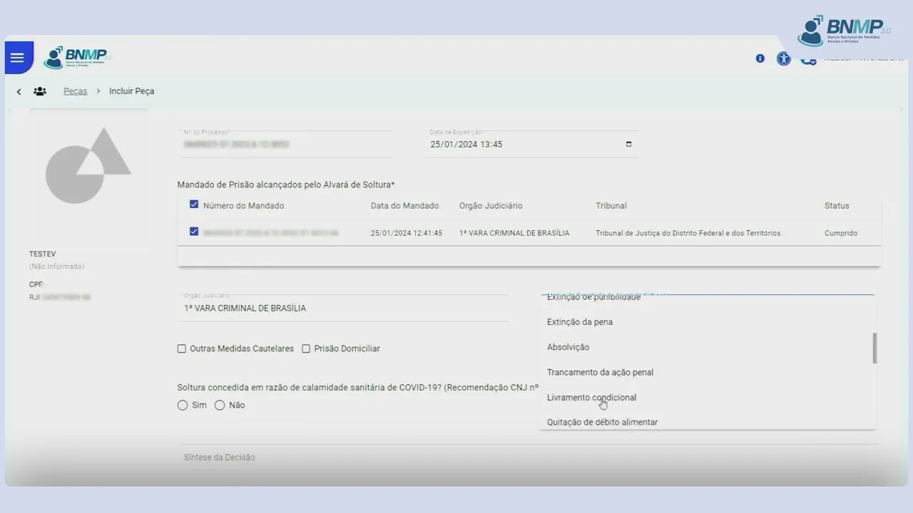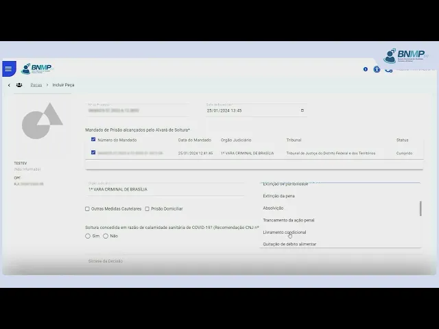 [Música] Como cadastrar a peça alvará de soltura com prisão domiciliar para localizar o cadastro da pessoa em pessoas cadastradas Clique na opção ver todas no campo pesquisar digite o nome da pessoa ou outro dado conhecido e Clique na lupa identificada a pessoa clique no menu localizado no canto direito da tela e selecione a opção incluir peça em dados da peça selecione alvará de soltura número do processo a que se refere o alvará informe o motivo da expedição do alvará de soltura clique no checkbox prisão domiciliar informe se a soltura foi concedida em razão de calamidade