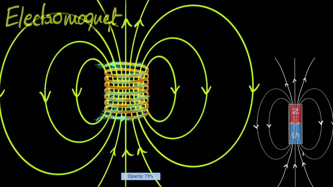 coils and we also want to show only a few one but let's imagine we add something like 50 coils i'm pretty sure you can guess what's going to happen the magnetic field inside is going to become almost straight now and these regions are also going to straighten out and so the new magnetic field of all these coils together will look like this and tada we have done it this looks exactly like what we wanted so if we have lots and lots of current carrying coils then it resembles a bar magnet now of course to make