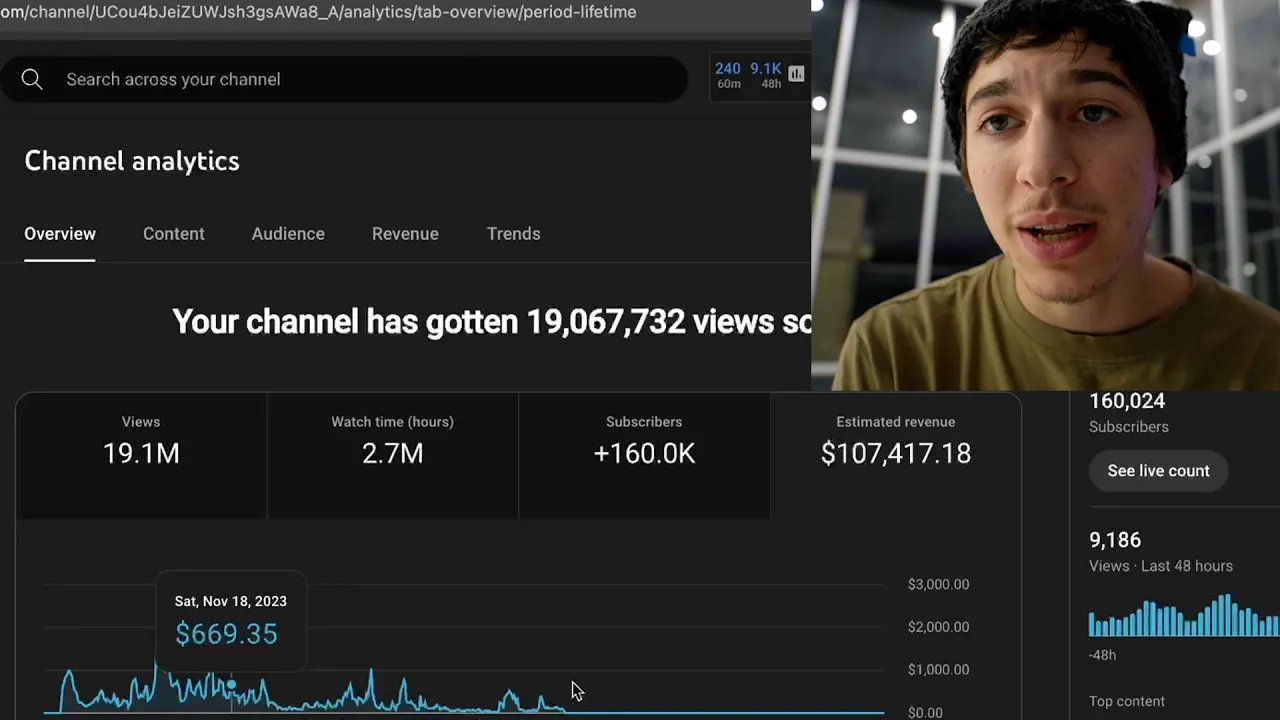 hey guys welcome back to my channel my name is Eddie Eiser and if you don't know who I am I'm a 20-year-old entrepreneur who makes his money through social media pretty much I've been doing this for around 4 years now I've run over 15 long form channels and I currently have eight that are active and as you saw on my YouTube dashboard a second ago I made $100,000 in 10 months with this one channel and I want to show you guys exactly how I did it so you can just copy what I did step by