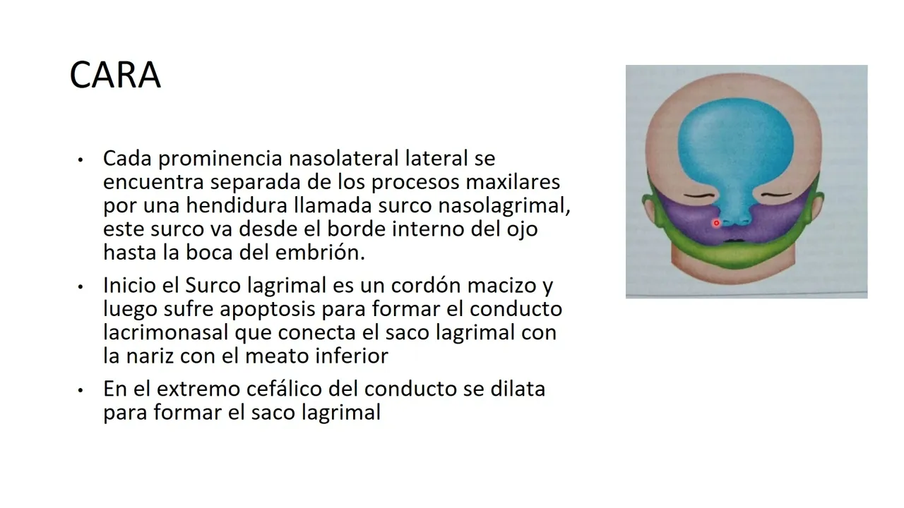 ojo hasta lo que es la boca del embrión se encuentran separados en su inicio el ectodermo lo que hace es tapizar ese surco formando lo que es un cordón macizo que luego sufre apoptosis para conectar lo que es el borde interno del ojo con la nariz más precisamente con el meato inferior llamándose de esta forma conducto lacrimo nasal este conducto lacrimo nasal va a tener en su extremo cefálico una dilatación donde se forma el saco lagrimal está la explicación de porque muchas veces cuando lloramos caen las lágrimas por lo que es la nariz en la