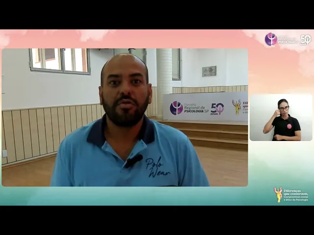 Olá eu sou o Eduardo Pedroso estou O Conselheiro do 17º plenário do Conselho Regional de Psicologia sou um homem negro de barba cerrada careca Estou vestindo uma camiseta Azul Clara que tem uma faixa azul escura no meio