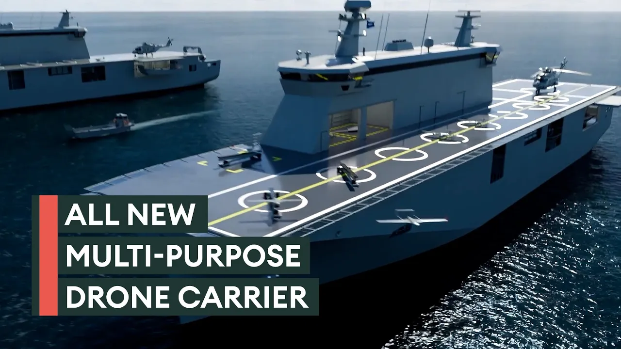 drones are transforming Warfare and support ships for the world's navies this is the multi-purpose support ship 9000 from International ship Builders Damon group designed mainly as a drone carrier for the deployment of uavs uuvs and usvs it's also a support vessel for Naval submarine rescue and Diving operations as well as helicopter and Maritime safety operations and search and rescue missions at 130 M long and a top speed of 18 knots it'll have a cruising speed range of 10,000 nautical miles AF and forward multimission drone Bays will house fixed wing and VTO drones and special Mission