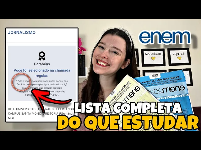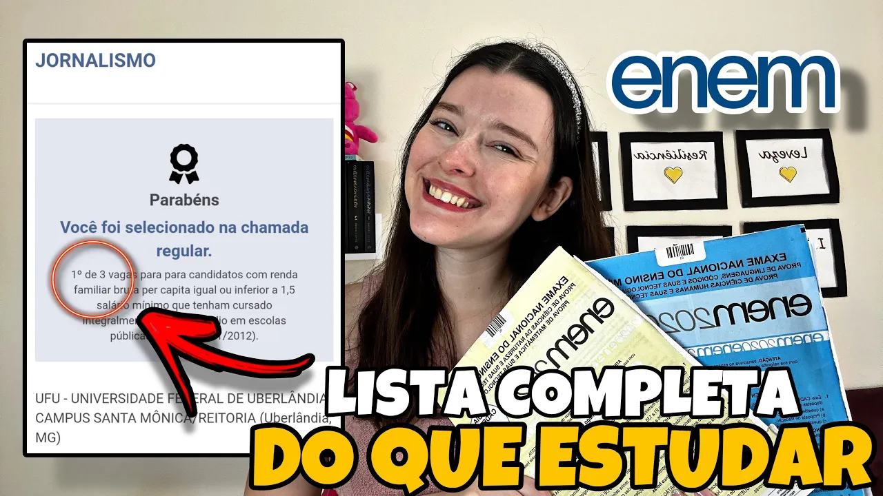 nesse vídeo eu vou te passar a lista completa de todos os assuntos que você precisa estudar pro Enem 2024 nesses três meses que faltam pra prova então já se prepara para anotar que a gente tá indo atrás da sua aprovação Oi gente para quem não me conhece eu sou a Duda tenho 21 anos e sou estudante de jornalismo na UFO que é a Universidade Federal de Uberlândia com o Enem 2020 por meio do cisu 2021 eu fui aprovada em primeiro lugar na Universidade Federal tendo vindo a vida inteira da escola pública estudando sozinha em casa