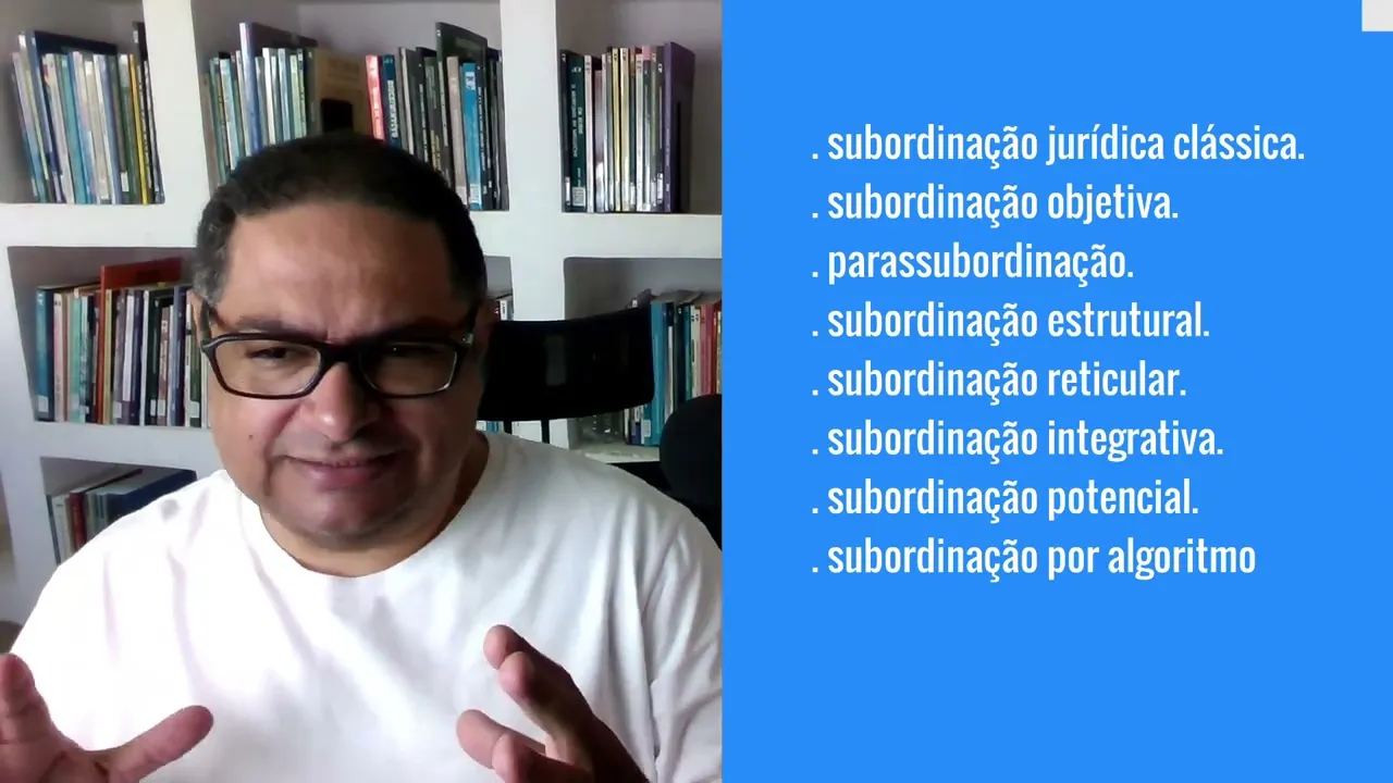 se ele se integrar naquela atividade estruturalmente faz com que ele possa ser demandado por ordens diretas e essa subordinação em potência faz com que ele esteja subordinado aqui mais uma vez o Retorno à subordinação objetiva e a subordinação estrutural e aí uma subordinação é impotência ele pode ser demandado por em por ordens diretas ele pode vir a receber ordens diretas então ele está potencialmente subordinado por último e talvez a que mais vai nos trazer enfrentamentos no futuro a subordinação por algoritmos ou subordinação algorítmica ela se estrutura né naqueles contextos de economia da tecnologia digital em