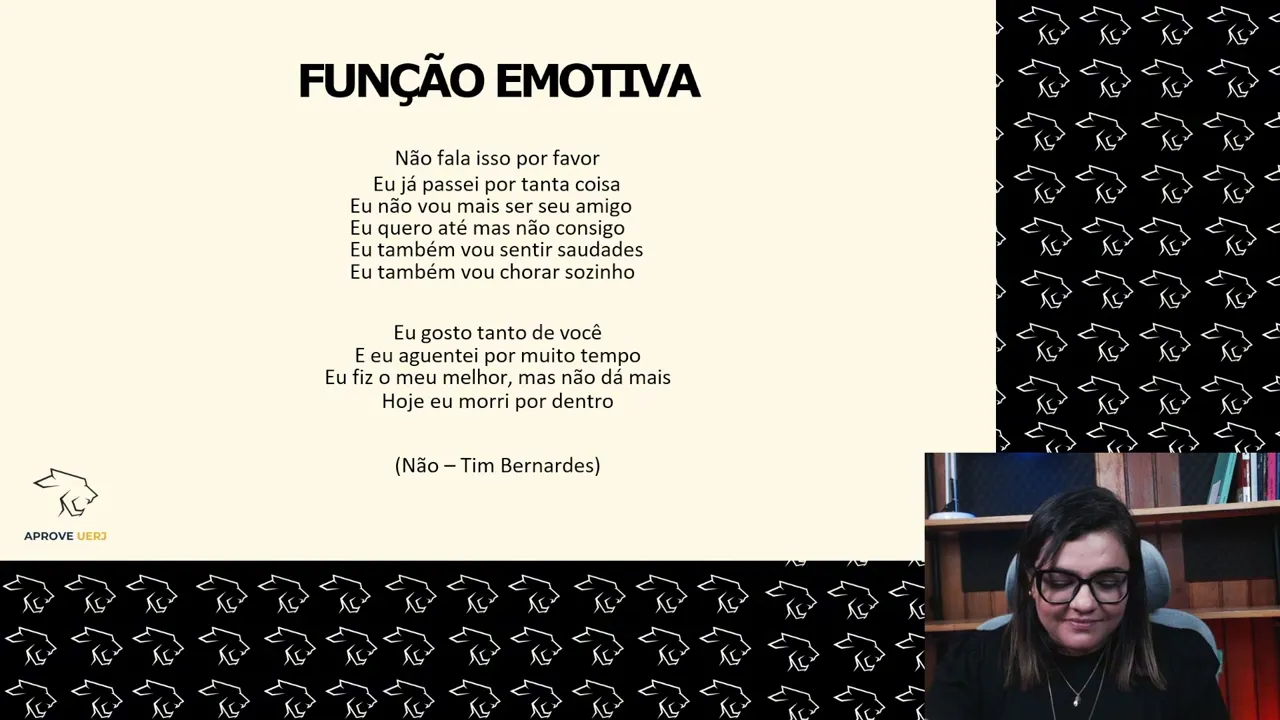 relatos pessoais e relatos de viagem então todos os tipos de texto que de certa forma você consegue identificar a presença da emoção de quem tá falando do sentimento de quem tá falando a gente vai chamar de função emotiva pode acontecer de mais de um texto de um texto ter mais de uma função pode não tem problema nenhum Mas tem uma que vai sobressair em comparação a outra tá então aqui ó Um clássico da nossa da nossa música brasileira e nessa loucura de dizer que não te quero vou negando as aparências disfarçando as evidências Mas para