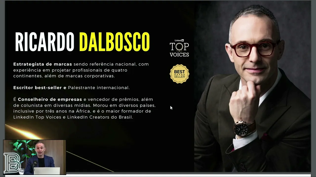 [Música] bom não sei se você sabia mas você é uma marca e por anos a gente ficou dependente do chamado CNPJ ser o Fulano da empresa x ou Y Mas será que a sua marca pessoal está bem posicionada para você ser cada vez mais requisitado como Conselheiro e conselheira no mercado prazer eu sou o Ricardo Dalbosco estrategista de marcas pessoais marcas corporativas em quatro continentes eu tive uma trajetória brilhante como C level E também como Conselheiro e hoje em dia acabo projetando vários profissionais para se tornarem cada vez mais requisitados no mercado Além disso atuo
