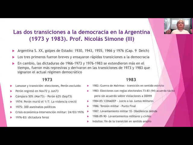 bueno continuamos lo que había quedado pendiente en la última parte del capítulo que tiene que ver con los golpes de estado y las dos transiciones que es lo que da origen al capítulo que estamos presentando la argentina tuvo muchos golpes de estado y tuvo buenos 56 podríamos agregar a este listado en el 62 pero no importa son muchos el estado y en consecuencia hubo muchas transiciones en este caso nos focalizamos en las dos últimas este pero bueno en cada uno de cada uno de estos golpes de estado sobrevino algún tipo de transición a la democracia