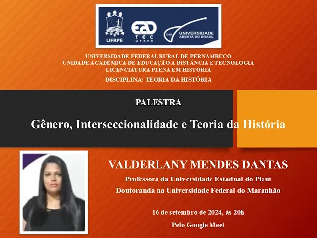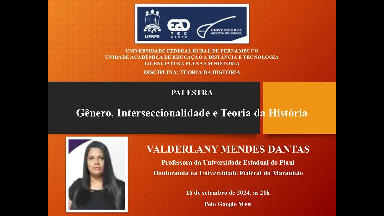 um pouco né mais tradicional mas com algumas inovações e problematizações mais atuais e agora na segunda parte da disciplina a gente tá trabalhando as discussões atuais mesmo né a gente trabalhou decolonialidade agora interseccionalidade depois a Própria história digital que é um tema que tá se discutindo bastante tá bom e PR a gente trazer fazer algo novo né não ser só mais uma aula a gente decidiu fazer uma palestra um né algo diferente né E aí trazer alguém né de fora do contexto da UFRPE mas que é especialista na temática que a gente tá abordando nessa