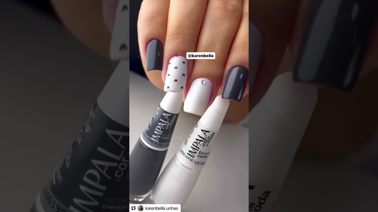então eu busco mais por cores mais próximas até pegar um pouco mais de experiência né e consegui fazer com cores bem diferentes que tem maior contraste entre as duas então aqui eu vou estar utilizando o doce Pérola da Risqué que esse cinzinha é bem claro Olha que lindo gente já arrasa sozinho né E aí eu vou complementar com o recomeços que é este aqui da Impala que é um Cinza Mais Escuro e eu finalizo com o Black Tie que é um esmalte preto da Dailus tá para dar uma finalizada aqui nessa sequência eu poderia muito