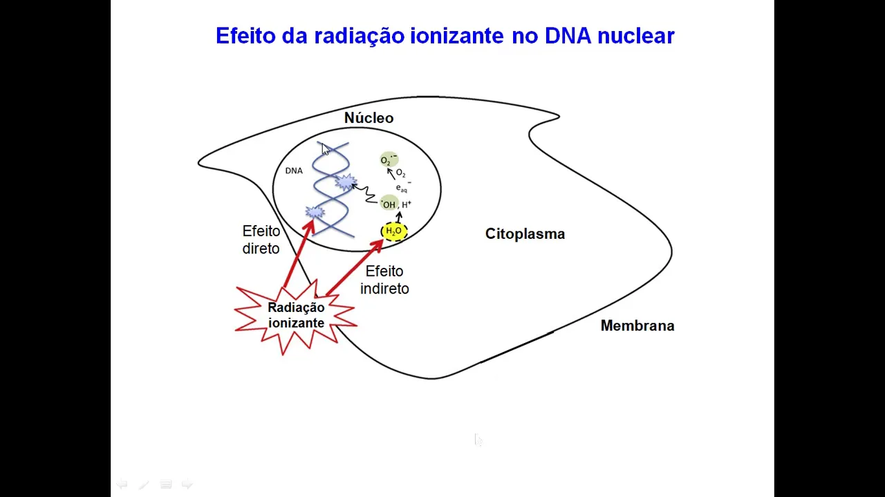 tá se cuidando e o que os radicais livres causam nas células bom esse é uma representação de uma célula para você vir aqui destacado o núcleo dentro do núcleo o DNA e aqui tá o citoplasma e os controle a membrana plasmática os radicais livres eles causam que a gente chama de efeito indireto então radiação ionizante vai que levar a molécula de água geral Radical Livre hidroxila que ataca o DNA e outra coisa que pode acontecer é que lembra que a radiação ionizante ela consegue retirar elétrons da última camada esses elétrons aquele Eletro que ficou com