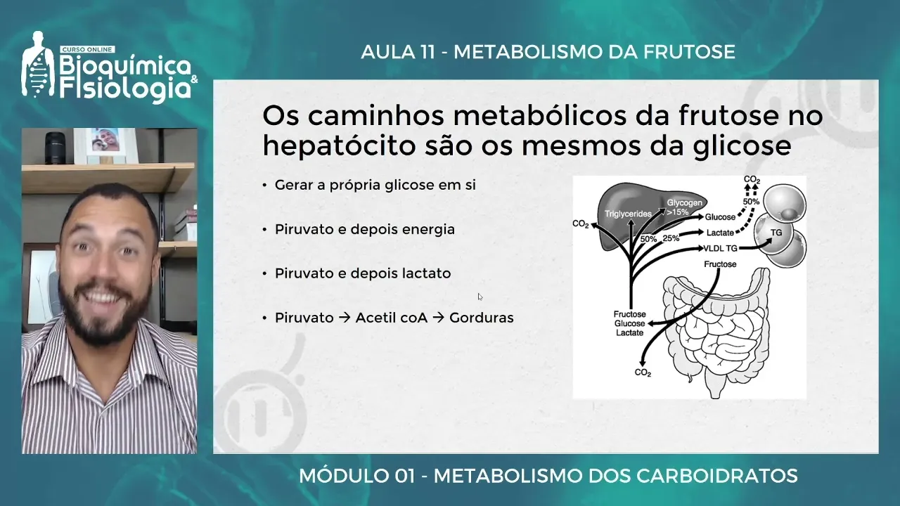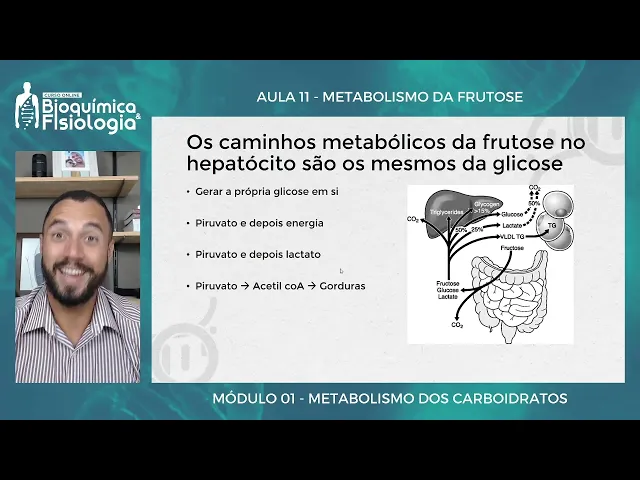 Olá tudo bem seja muito bem-vindo a mais uma aula aqui do metabolismo dos carboidratos nessa aula em específico nós iremos abordar abordar o metabolismo da frutose Sim esse monosacarido que está envolvido em muitas polêmicas né Existem muitos mitos relacionados ao a frutose em si e posso afirmar para vocês que a maior parte desses desses mitos né É decorrente de um ma entendimento do metabolismo da frutose então eh O objetivo dessa aula é fazer você entender né os passos metabólicos da frutose em nosso organismo para você ver que esse nutriente né Por assim dizer Esse monossacarídeo
