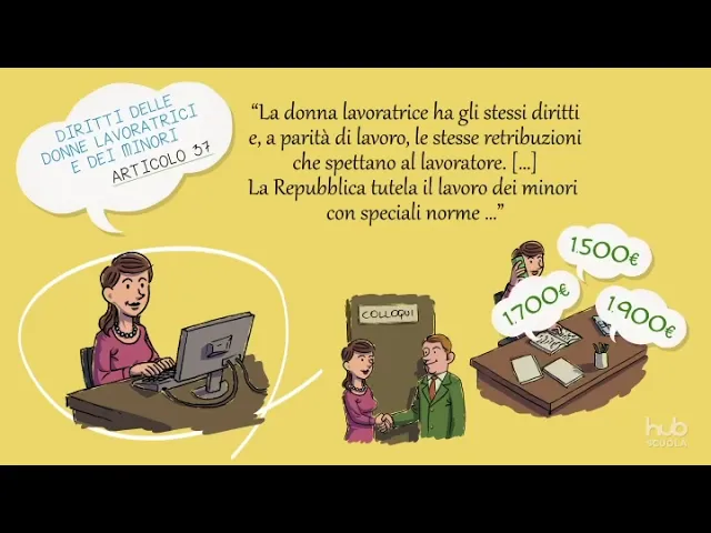 i diritti delle donne lavoratrici e dei minori in particolare la costituzione stabilisce che le donne lavoratrici hanno gli stessi diritti degli uomini ea parità di lavoro hanno diritto alla stessa retribuzione l'articolo vieta così ogni forma di discriminazione nei confronti delle donne pane lavoratrice infatti devono essere garantite le stesse opportunità dei lavoratori in termini di opportunità di accesso al lavoro possibilità di migliorare la propria posizione all'interno dell'azienda e di occupare posti di responsabilità ottenere un salario adeguato alle proprie funzioni e capacità lo stesso articolo 37 stabilisce i principi fondamentali che regolano il lavoro dei minori che