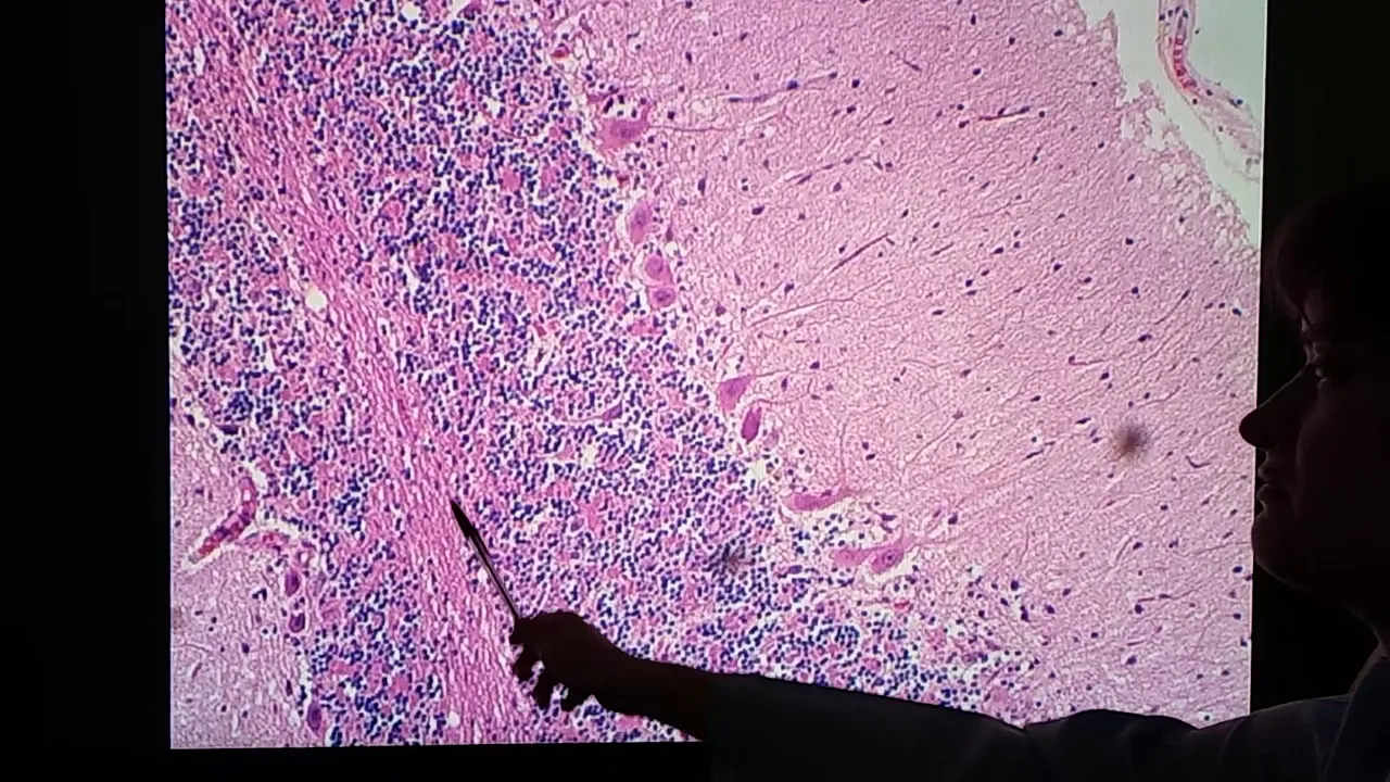 aqui está focalizado apenas na substância cinzenta que a maior parte aqui do cerebelo aqui em detalhe o corpo celular da das células de purkinje bem grande aqui o núcleo no cléo citoplasma cobra bastante intenso aqui em tom de rosa e dá para observar partindo dele aqui algumas porções os dendritos tenho aqui é outra parte aqui em direção à camada molecular tão pouco quase todas essas projeções rosas aqui são dendritos ramificações em gritos de células de purkinje e entre eles a gente encontrou alguns outros neurônios ou células da glia mas que não dá pra identificar bem