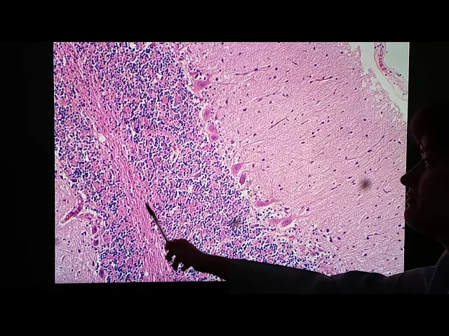 está a substância branca que ela é composta de axônios de neurônios vou passar nova novamente um aumento maior agora nos 100 vezes pra gente ver mais detalhes lançamos aqui no momento de cem vezes não dá pra gente vê agora as camadas camada novamente nos pés de fora pra dentro camada molecular camada de células de purkinje e camada granulosa essas três então fazendo parte da região cortical composta por substância cinzenta aqui no meio bem fina camada medular que a substância branca que é onde são os axônios desses neurônios minha principal dessas camadas é a camada de