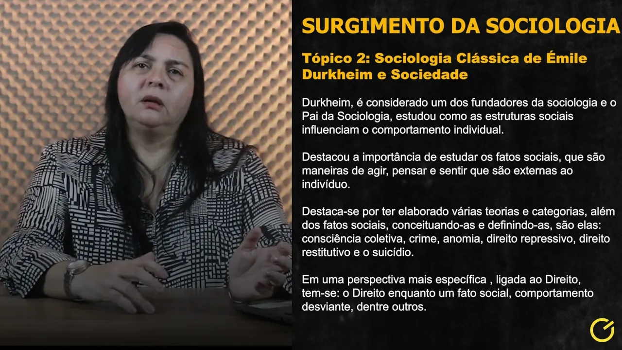 Assim, seguimos para o próximo tópico. O tópico dois trata sobre a sociologia clássica de Émile Durkheim, que é considerado um dos fundadores da sociologia. Ele estudou como as estruturas sociais influenciam o comportamento individual e destacou a importância de estudar os fatos sociais, que são maneiras de agir, pensar e sentir que são externas ao indivíduo.
