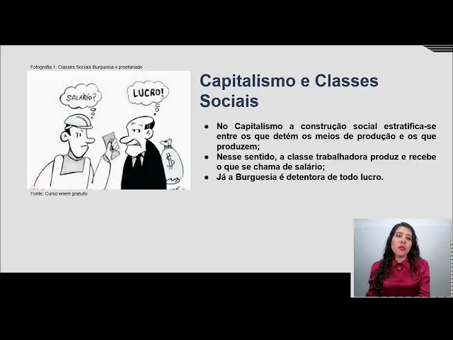 O capitalismo e as classes sociais: essa figura exemplifica muito bem quando o dono da empresa, diante da constituição do burguês, paga salário. Aí vemos as relações de trabalho sendo instituídas, não apenas os direitos trabalhistas. Na relação de trabalho, temos o burguês que produz o capital, mas ele não produz o capital com seu trabalho; ele paga alguém para executar e produzir seu lucro financeiro.