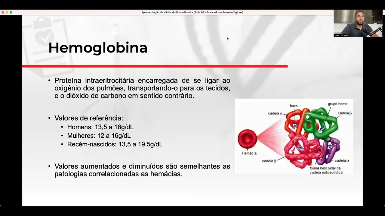 reduz então tem desidratação diarreia tudo isso gera aumento por exemplo né leucemia infecção grave tudo isso aumenta a quantidade de fluido no sangue e dilui a emass mas a concentração de hemoglobina não então a gente tem a concentração de hemoglobina que é essa proteína nas hemácias como parâmetro chave no diagnóstico de anemia o que que é hemoglobina proteína intra eritrocitária Ou seja proteína que está dentro do eritrócito da cé vermelha da hemácia que tem como função carregar o ferro a gente tem a estrutura proteica tá vendo a gente tem o que a gente chama de