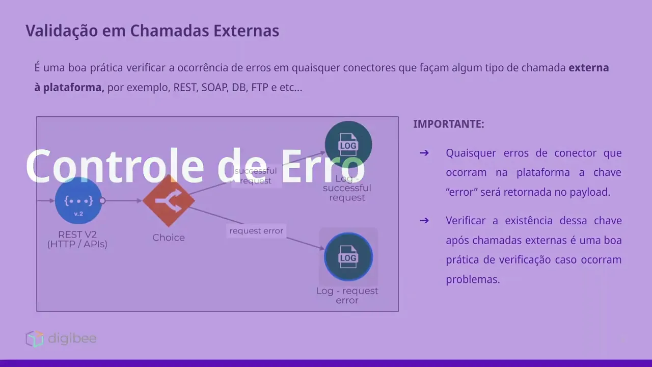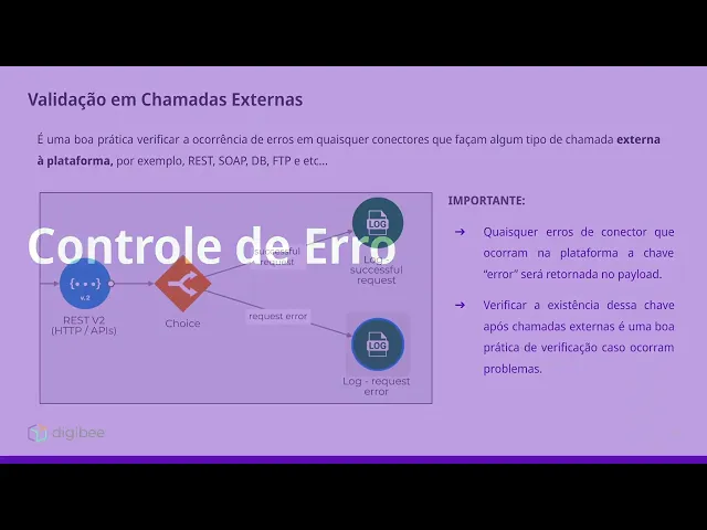 Olá ess é integration developer bootcamp estamos na etapa de boas práticas de desenvolvimento nesse vídeo falaremos sobre como é feito o controle de erros dentro dos fluxos validação em chamadas externas é uma boa prática verificar a ocorrência de erros em quaisquer conectores que façam algum tipo de chamada externa na plataforma por exemplo chamadas rest soap bancos de dados FTP e outros para isso para qualquer erro de conectou a plataforma retornará a chave error no payload e verificar a existência dessa chave é o suficiente para verificar se as chamadas foram bem sucedidas ou má sucedidas no