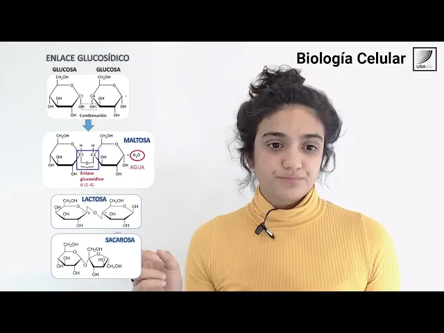 acuosa Entonces nos encontramos así porque son más estables Cómo es que estos monosacáridos se unen entre Sí bueno se unen a través de enlaces glucosídicos como veremos en la próxima placa estos enlaces luego secos son una condensación de estos hidroxilos de dos monosacáridos diferentes en el que pierde una molécula de agua y se forma el enlace glucosídico cuando dos monosacarios se unen a través de un enlace de glucosídico se forma lo que se llama un disacárido por ejemplo la maltosa es un disacárido de glucosa está formada por dos glucosas que se unen la lactosa es