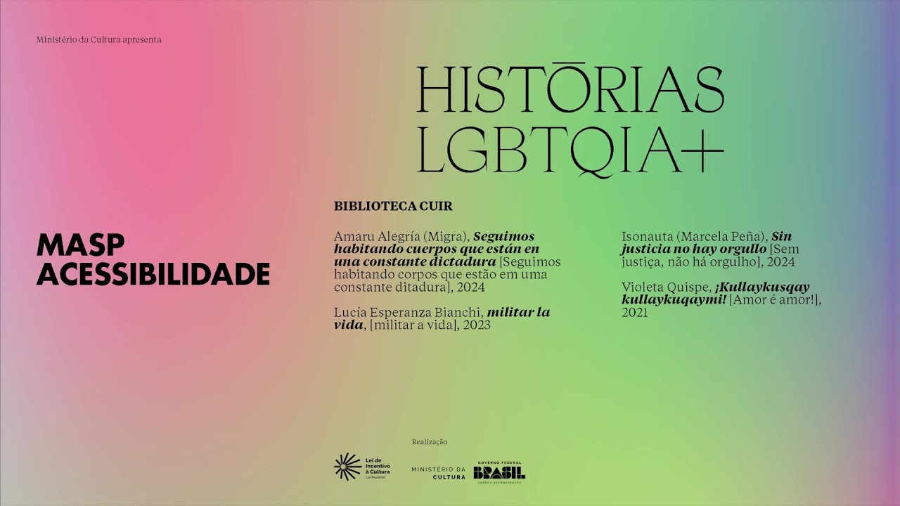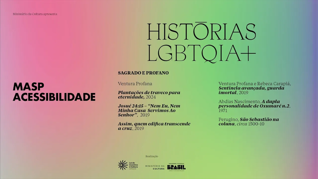 ministério da cultura apresenta MASP acessibilidade histórias LGBT mais curador ado pedos jia BR Wilson com colaboração de andé Mesquita e assistência de Leandro Muniz te acessibilidade Ana Amaral Daniela rodg Silva produção audiovisual E Consultoria em acessibilidade mais di Inter em li Paula Rosa Gomes montagem audiovisual cabr escritório de imagem Museu de Arte de São Paulo a atrian 2024 lei de incentivo à cultura ministério da cultura e Governo Federal