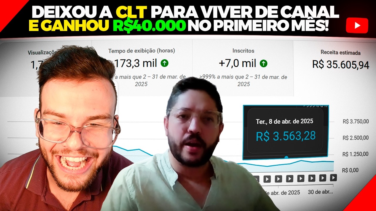 o próximo. Ah, vocês já entrevista do Luiz? É cara, umas 10 vezes eu assistiu, cara, não preciso pegar, preciso pegar. Ele até falando alguma coisa ali entre eles que eu preciso pegar. Falei: "Cara, então hoje a gente tá aqui com o Thiago, né? O Thiago aí que conseguiu monetizar dois canais basicamente em tempo record, só que um dos um dos canais dele tem um detalhe muito curioso. Chegou a 100.000 de faturamento no primeiro mês que ele Conseguiu criar e teve um dia que inclusive ele chegou a ganhar quase R$ 10.000 no dia. Só como já