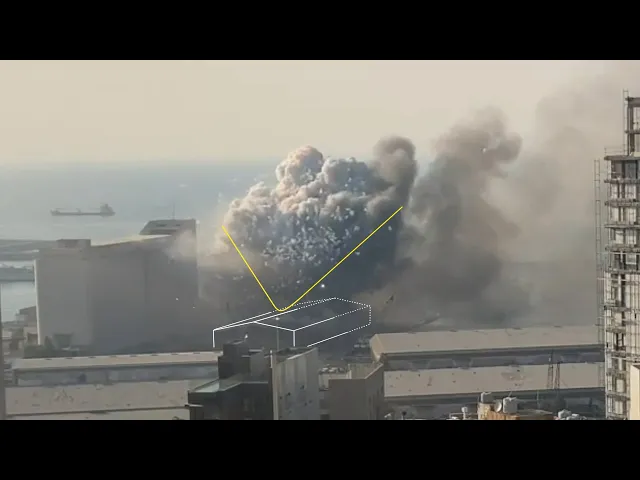 35 seconds later at 608 pm a large spherical plume appears above the center of the warehouse according to the explosives analyst the symmetrical shape of the sphere suggests that it's a single point explosion originating in one particular place within the warehouse and it's possible that as little as half of the 2750 sacks of ammonium nitrate stored inside detonated we use the shape of the two plumes from these explosions as metadata to synchronize the remaining footage this video taken from further back provides an uninterrupted view of the events that followed within the span of nine seconds
