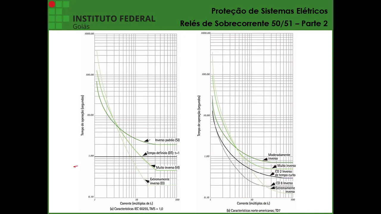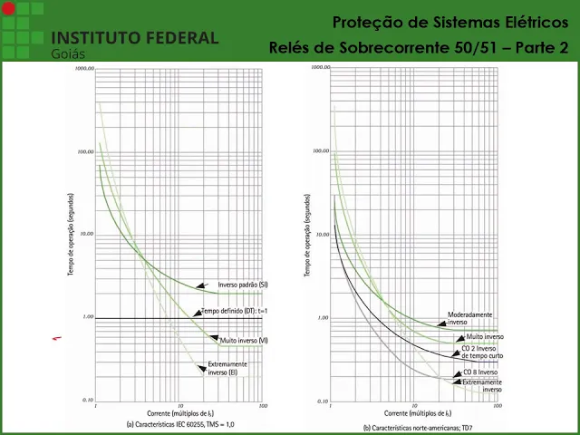 aqui em vez do tms nós temos um td que é mesma coisa que eu de ter só que só que está em português né o outro era depende de ir ao time e aqui é td de tempo de dial também chamado de ajuste de multiplicador o princípio entre as duas normas é o mesmo lembrando que esse essa norma que aí 3r anterior é e esse e essas curvas aqui comparam as duas normas aí três é e as a norma americana então nós temos aqui as curvas definidas pela pelas primeiras equações apresentadas a esquerda ea direita