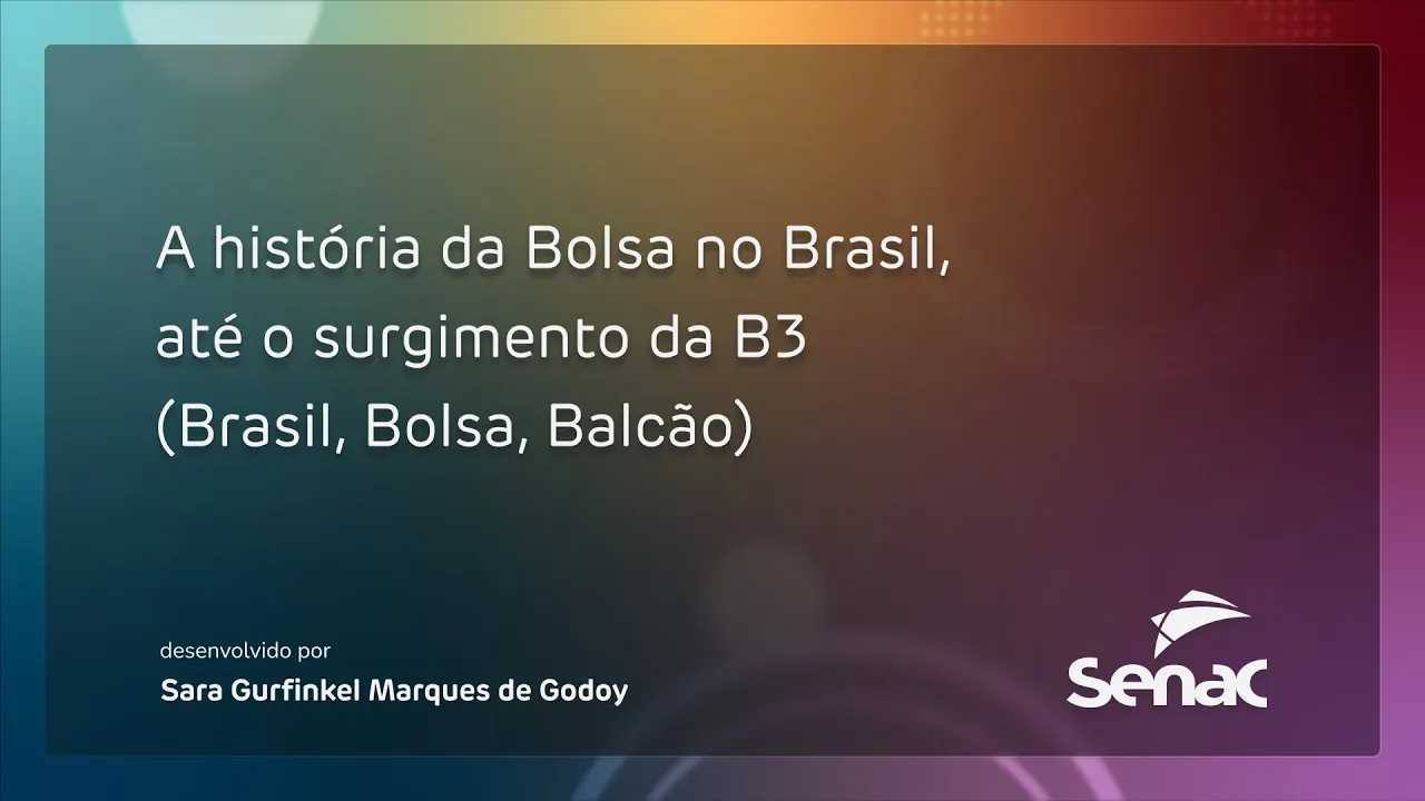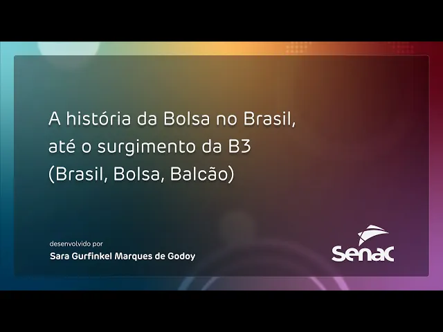 A história da Bolsa no Brasil, até o surgimento da B3 (Brasil, Bolsa, Balcão) Olá, tudo bem? O objetivo deste vídeo é apresentar a evolução do mercado de capitais brasileiro por meio da demonstração do processo histórico da bolsa do Brasil. A criação da B3, a Bolsa de valores oficial do Brasil, afetou a economia como um todo, e teve influência tanto nas mudanças de comportamento em relação à governança corporativa das bolsas quanto das empresas em geral.