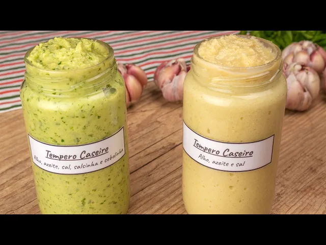 e Vem Comigo aprender a fazer um tempero caseiro infalível gente eu vou ensinar dois hoje para vocês com três ingredientes e com 4 ingredientes vamos bora pra receita [Música] oi oi hoje a receitinha é para facilitar a vida da gente eu vou ensinar vocês a fazer esses dois temperos que são super fáceis só preciso de algumas dicas tá porque assim gente quer fazer ele que ficar um bifinho tem né picar o alho colocar os temperinhos você já vai ter de dois tipos maravilhosos de temperos vai fazer o feijão vai fazer o arroz Olha que beleza