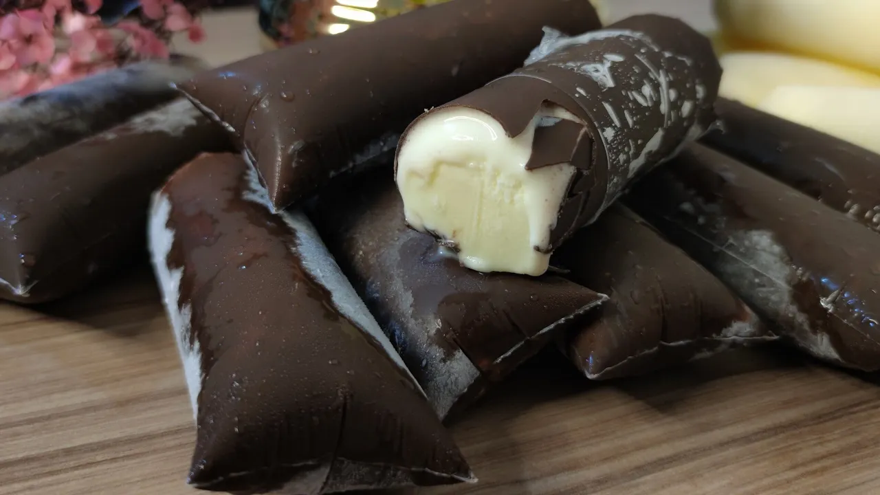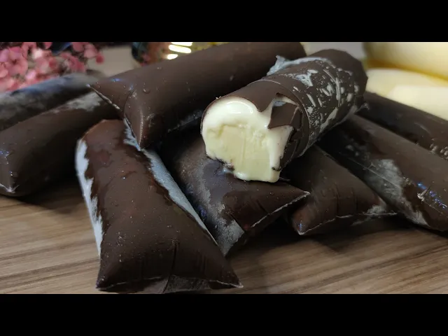 video I will also leave the amount I paid for each ingredient and the suggested price for sale and the base looked like this after resting The foam went down and look how creamy it is now I'm going to fill the bag I'm going to put 150 ml in each bag to Filling is very easy, just fit the funnel and top up with the liquid when tying. Hold it very close to the liquid, it turns well to make it firm and just tie the knot. tip inside the ring And just pull it, cut off the excess bag, right, so your ice cream will look prettier And that's it, folks, I'll finish filling all the other bags, I'll be back to show you the yield That's it, I finished filling the bags and they yielded 15 units As you can see here, there were four left without the cone, as I told you, you can do it with 20 or 30 G, as I did with 30, there ended up being a little bit left for these four, so I didn't want to melt any more chocolate, but if you just do it, with 20 G, you'll be able to put it in all the bags, okay, if you want to do like me with the cone a little thicker, then you'll put 30 G in each bag and you'll need four squares like that, look how beautiful What 's left now I'm going to take it to freeze and I'll be back to show you the final result I'm back to show you the result of this frozen ice cream but before I show you I want to ask if you liked the video leave a like and if you're new here if Subscribe and activate the bell so you don't miss the next recipes and for those who don't know yet, I created a second channel where I share recipes, there are also everyday recipes like cake, bread, biscuits, these homemade things that aren't for sale, right?