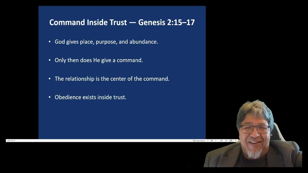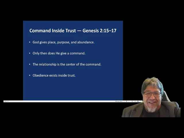 lives with God and receives life for him. There is no worry about doing anything wrong. So I want you to notice the order. God gives a place. God gives a purpose and God gives abundance. Only then does he give a command and the command is not the center of the relationship. The relationship is the center of the command. Let me say that again. The command is not the center of relationship. The relationship is the center of the command. It's because of relationship. Obedience exists inside trust of the living God. Thi this really matters. And if