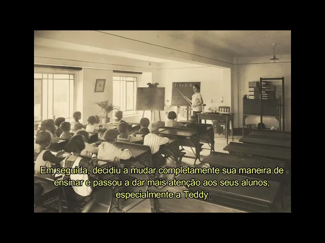 E aí [Aplausos] E aí e a Renata a senhora Thompson que no seu primeiro dia de aula Parou em frente aos seus alunos da quinta série primária e como todos os demais professores eles disse que gostava de todos por igual no entanto ela sabia que isto era quase impossível já que na primeira fila estava sentado um pequeno garoto chamado teste a professora havia observado que ele não se dava bem com os colegas de classe e muitas vezes e suas roupas estavam sujas e cheiravam mal e houve até momentos em que ela sentia prazer em lhe