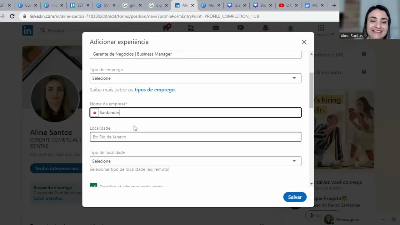 inglês e em português se for o seu caso tipos de tipo de emprego não precisa colocar só tá perguntando aqui ó só tá falando se era freelance temporária não tem necessidade joia o nome da empresa tem necessidade você que tem o seu currículo é só vir aqui copiar e colar senão é só você digitar também vamos supor que foi no Santander gente para o Santander é só o nome que eu lembrei aqui e tô falando tô colocando isso como exemplo tá bom você trabalha nesse cargo atualmente você deixa aqui ó tiquezinho se não trabalha você