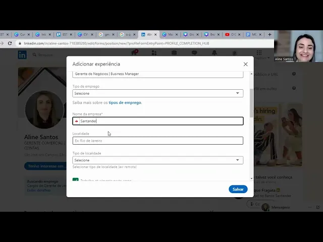 a próxima aula que para quem não comprou o currículo aqui destaca vai aprender na próxima aula ou pode pausar essa aula aqui aprender lá primeiramente Beleza dá um salvar e vamos ver como que vai ficar a experiência Olha que interessante ó ele já que foi no Santander que eu entrei com assistente de contas Aline mas anteriormente a isso eu trabalhei em outra empresa é só você vir aqui clicar no mais adicionar cargo e fazer o procedimento novamente como que ficou aqui então Ó e lá como assistente comercial eu trabalhei no Banco Safra e aí ficou