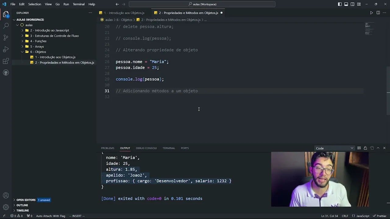 [Música] fala Mestres beleza na aula de hoje nós vamos entender aqui mais sobre propriedades e métodos nos nossos objetos a gente vai explorar aqui um pouco mais sobre trabalhar né manipular as propriedades e também ver mais sobre métodos que são funções né só que dentro dos objetos então aqui no nosso vias code Eu Já criei aqui o objeto pessoa né que tá com a propriedade nome idade e altura tá então o que a gente vai ver aqui agora é como eh adicionar né então que adicionando eh uma propriedade eh simples em um objeto na verdade