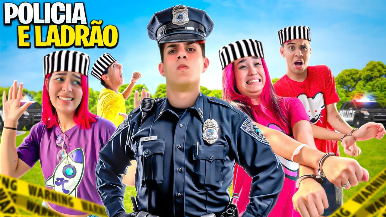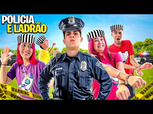 no vídeo de hoje vamos brincar de polí e ladrão explica o vídeo jum explica o vídeo explica o vídeo o vídeo de hoje vai ser o seguinte gente eu vou ser o policial e vocês vão ser os ladrões vocês vão ter um tempo para se esconder como se fosse um esconde esconde só que quando eu encontrar vocês no lugar em que vocês se esconderam vocês vão poder correr de mim acho que a potenta tem que ser ladrão porque ela roubou meu coração meu lei dobr Quando eu encontrar vocês podem correr e eu tenho que tocar