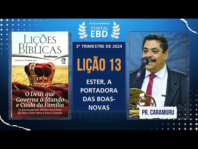 o terceiro trimestre de 2024 quando nós estudamos o tema o Deus que governa o mundo e cuida da família ensinamentos divinos dos livros de Rute e Ester para a nossa geração e hoje na última lição estaremos estudando os últimos capítulos os capítulos 8 a 10 do livro de Ester o título da nossa lição de hoje a lição de número 13 é Ester a portadora das Boas Novas Aqui nós já vemos uma uma tipologia né estter ela obtém o livramento do seu povo mas ela vai anunciar através de cartas né na verdade ali eh Duas cartas
