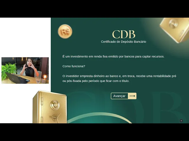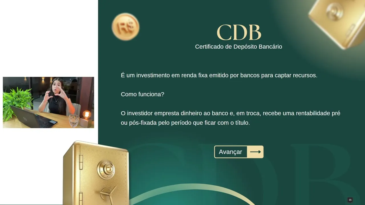 começar a investir Identificar qual é o seu perfil para você já ir nas ações nos papéis os títulos que fazem mais sentido para você começando pelo CDB o que seria CDB significa certificado de depósito bancário como funciona é investimento de renda fixa que tem um objetivo de você investidor emprestar o seu dinheiro para o banco e ele te remunera por conta disso paga juros por conta disso o banco funciona como intermediário então ele precisa captar recursos para passar a ser recursos para as pessoas que precisam de empréstimo e assim funciona o CDB Então você compra