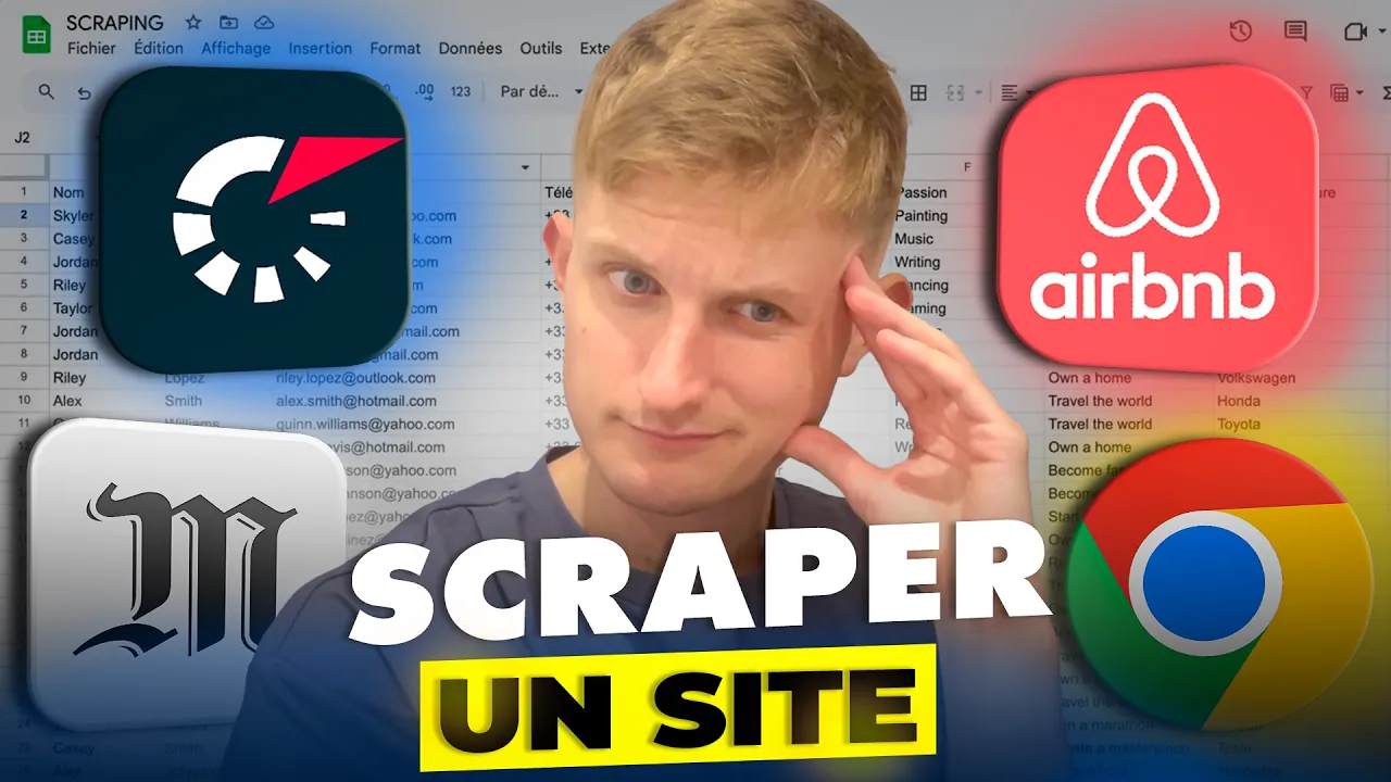 cette vidéo je vais te montrer comment je scrappe des données depuis un site Internet ça peut être très utile pour récupérer une adresse mail pour récupérer des adresses vers des réseaux sociaux pour récupérer la liste des tarifs d'un concurrent récupérer une description détaillée de ce que fait une entreprise il y a plein de raisons pour laquelle scrapper un site peut être intéressant pour ton business pour le business de tes clients ça fait partie des prestations que je propose aux entreprises avec qui je travaille donc je me dis que ça peut t'intéresser si toi aussi tu as envie de vendre des automatisations et si par contre tu as une entreprise et que tu veux savoir comment récupérer des informations chez tes concurrents ou sur n'importe quel site alors cette vidéo est faite pour [Musique] toi commençons par te montrer un exemple donc j'ai pris des carrosseries sur camp pour l'exemple donc l'objectif ce serait potentiellement d'aller récupérer un numéro de téléphone récupérer une adresse mail selon le type de business on peut également essayer de récupérer le LinkedIn en l'occurrence moi je me dis que pour des carrosseries et bien essayer de récupérer par exemple une page Facebook ici donc pour ça tu vois ici dans le cadre de cette vidéo j'ai listé six entreprises donc ces six carrosseries justement qui sont basées sur quamp et l'objectif ça va être d'aller récupérer une adresse mail un numéro de téléphone et une URL Facebook la colonne statue elle elle va uniquement me servir à une fois que j'ai récupéré les données on va écrire terminé et du coup on saura que on ne doit plus aller essayer de récupérer des données sur ce site c'est toujours intéressant de mettre une colonne statue si toi actuellement tu utilises pas Google sheet mais que tu as un CRM que tu as ATABLE il est bien sûr possible de faire la même chose je te rassure pour récupérer ces informations et bien on va aller sur make. com make. com si tu ne le sais pas c'est l'outil qui permet d'automatiser énormément de choses dont le scrapping donc voilà à quoi ressemblera notre automatisation je vais te mettre un lien dans la description pour que tu puisses la télécharger hein je vais la montrer ici étape par étape mais voilà à quoi elle ressemblera tu peux la télécharger pour gagner du temps tu peux la télécharger pour éviter de faire des erreurs je sais qu'il y a des formules si par exemple je vais ici tu vois il y a une formule un petit peu compliqué au moins si tu la télécharges tu pourras directement t'assurer que tu as pas fait d'erreur pour la recopier donc une fois que tu l'as téléchargé tu cliqueras ici sur les trois petits points puis importe blueprint et ici le choisir un fichier tu auras plus qu'à aller récupérer le fichier que tu viens de télécharger voilà donc sur ce moi je vais créer un nouveau scénario et ensemble on va créer ce système de scrapping donc quand tu as créé un nouveau scénario normalement tu arrives sur cette interface là en cliquant sur le plus ici on va d'abord aller récupérer nos lignes dans Google sheet donc je vais taper Google sheet il est là et ensuite je vais aller dans search rose ici j'ajoute le module ici tu vas devoir te connecter si tu ne t'es jamais connecté à Google sheet et bien normalement tu devrais avoir un bouton Créer une connexion et tu devrais en cliquant sur Créer une connexion avoir ça donc tu vas ici cliquer sur sign in with Google un popup devrait s'ouvrir tu as plus qu'à donner les différentes autorisations et normalement le pop-up se ferme et tu auras accès à la même interface que moi ensite on va venir récupérer notre spreadsheet ID donc c'est simplement le nom du spreadsheet enfin du Google sheet qu'on vient de créer donc moi j'ai dû l'appeler carrosserie il est là va choisir le nom de la feuille donc si tu as nommé tes feuilles tu devrais retrouver la tienne colonne range on va laisser juste à Z je pense que c'est pas très on a pas beaucoup de colonnes et dans filter c'est justement là qu'on va pouvoir spécifier donc là le statut le statut on va vérifier qu'il n'existe pas donc en fait ce filtre il nous permet de vérifier et de récupérer uniquement les carrosseries pour lesquelles on a déjà scrappé les informations tout simplement et la limite et ben on va pas mettre de limite pour l'instant quoi que pour cette vidéo on peut mettre une limite deux pour ne pas récupérer toutes les données ça ne sert à rien de tout récupérer mais toi tu as pas besoin de mettre de limite al ici on a un petit point rouge souvent avec Google sheet c'est simplement qu'on doit réouvrir le module et qu'on doit de nouveau cliquer sur OK et normalement l'erreur voilà disparaît très bien donc là si je fais un run one pour tester qu'est-ce qu'on va récupérer ben on va récupérer deux résultats normalement voilà dans la partie output qui signifie la sortie on a récupéré deux bundles des bundles qu'est-ce que c'est ce sont simplement des packs de données en l'occurrence ici on a récupéré le contenu de la colonne A pour nos deux bundles on n pas récupéré d'autres informations puisqueactuellement dans notre Google sheet si on va là on a effectivement que la colonne A qui est remplie dans les autres on a rien une fois qu'on a ça et ben on va lancer un module HTTP c'est ce module HTTP qui va nous permettre de récupérer le contenu des sites internet donc on va ajouter le module make request dans l'URL on va venir ajouter justement le contenu de notre colonne A dans lequel on a l'URL du site et je crois que c'est tout pour ce module très bien si je fais un test normalement le module HTTP devra être exécuté deux fois voilà il y a bien un de ça veut dire qu'il est exécuté deux fois opération une qu'est-ce qu'elle nous renvoie et bien c'est surtout la partie data qui nous intéresse la variable data elle nous renvoie tout le contenu HTML 