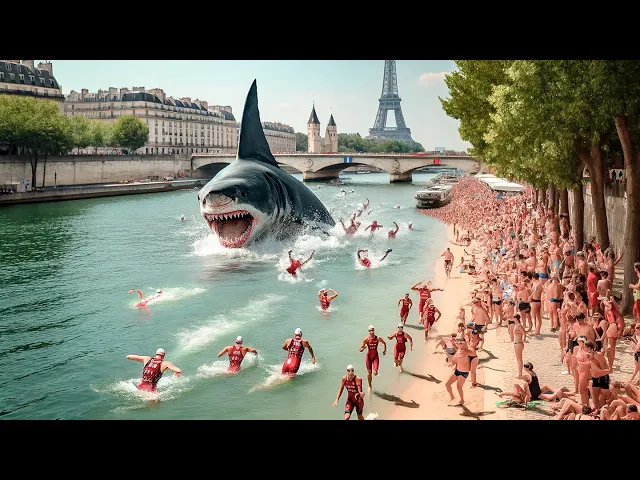 incidente pois ali é onde o ninho principal deve estar eles vão até o fundo e seguem por uma passagem Estreita com um propagador de ondas sonoras que imitam o som de tubarões para mantê-los em um local enquanto isso às margens do rio Sena vários Soldados do exército redirecionam algumas pessoas e outros patrulham nas águas enquanto os nadadores da competição estão em posição para começarem várias pessoas estão ansiosas pelo início da competição sem fazerem ideia do perigo que está sob elas a prefeita chega ao local e continua afirmando para a imprensa que não há o que